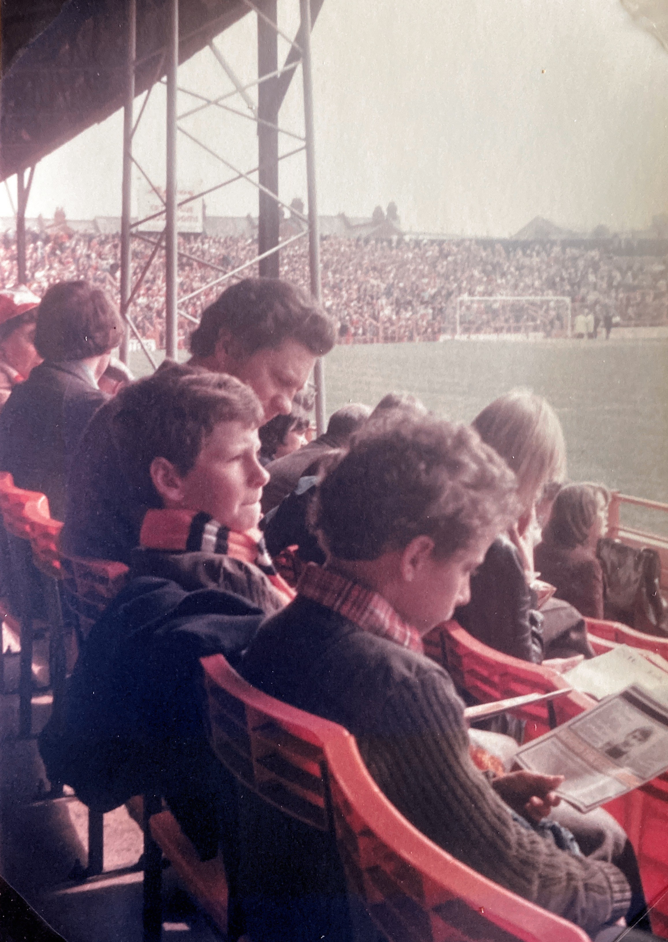 1977, one of my earlier games at Kenilworth Road, looking pensive before kick-off, seated in the Bobbers' Stand with my brother and late father, Professor Fred Bullock a Lutonian and life-long Hatter.